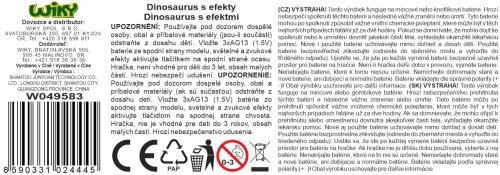 Dinosaurus s efektmi, červený. Rozmery 26,5x11x13 cm. Svetelné a zvukové efekty tlačidlom na spodnej strane chvosta (vysunie hlavu a otvorí papuľu s efektmi). 3xAG13 batérie súčasťou zo spodnej časti tela. Manuálne otváracia papuľa, pohyblivá a dopredu vyťahovacia hlava, pohyblivý chvost, ruky, predné a zadné končatiny.