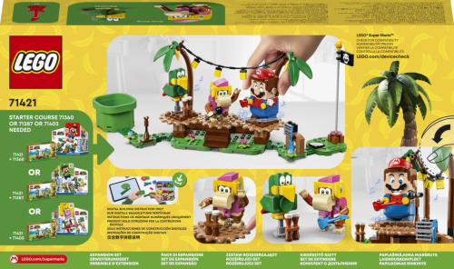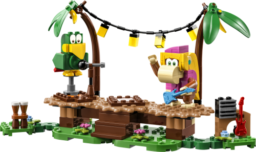 S týmto rozširujúcim setom LEGO® Super Mario™ (71421) Dixie Kong a koncert v džungli sa deti vydajú za hudobným zážitkom do džungle, v ktorej žije Donkey Kong™. Súčasťou sú figúrky Dixie Kong a papagája Squawkse, zostaviteľné pódium, scenérie džungle a hudobné nástroje a vybavenie. Umiestnite doprostred pódia figúrky LEGO® Maria, LEGO® Luigiho a LEGO® Peach™ (figúrky nie sú súčasťou balenia), pripojte ich a prepojené pódia sa začnú otáčať a aktivujú hudbu. Poznámka: Pre interaktívny herný zážitok je potrebný niektorý zo štartovacích setov 71360, 71387 alebo 71403.