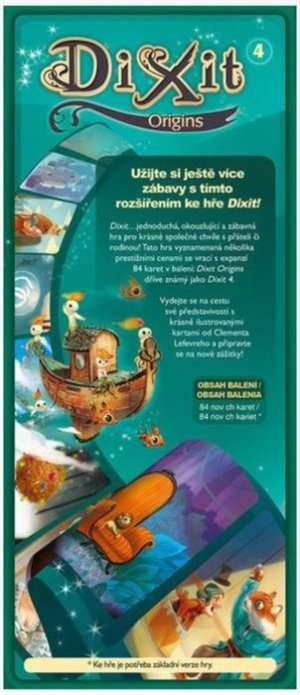 Dixit 4: Origins neobsahuje bodovaciu stupnicu, figúrky a tipovacie žetóny - je hrateľné iba so základným vydaním hry Dixit alebo Dixit Odyssey.