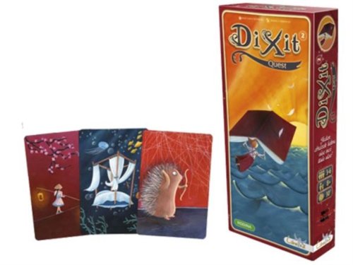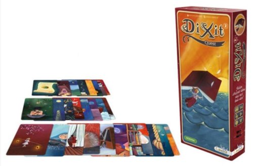 Dixit 2: Quest neobsahuje bodovaciu stupnicu, figúrky a tipovacie žetóny - je hrateľné iba so základným vydaním hry Dixit alebo Dixit Odyssey.