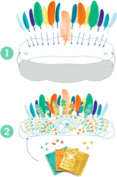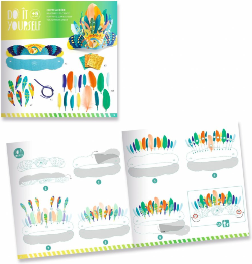 Roztvorte textilnú čelenku a odkryte samolepiacu plochu, kam môžete naaranžovať farebné pierka Po zatvorení jednoducho vylepšite čelenku kovovými nálepkami podľa tlačených farebných sprievodcov a vytvorte tú najkrajšiu slávnostnú čelenku hodnú samotného karnevalu v Riu! Textilná čelenka pre väčšie pohodlie a pevnosť Vyrobené tak, aby vyhovovalo všetkým veľkostiam hlavy. Jednoduchá tvorba: nová metóda lepenia s ľahko prístupným lepidlom na čelenku. Prémiový povrch so zmesou metalického a farebného syntetického peria. Ideálne na narodeniny a karnevaly. Balenie obsahuje: 1 samolepiaca textilná čelenka, 15 farebných syntetických perí, 7 ilustrovaných perí s kovovými detailmi, 3 sady samolepiek z metalickej mozaikovej peny, 1 plochá široká čelenka a 1 sada podrobných pokynov. Vyrobené z papiera a kartónu s certifikátom FSC®