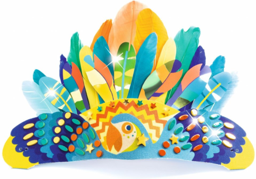Kreatívna súprava na výrobu tropickej čelenky s farebnými pierkami a samolepkami v štýle karnevalu v Riu.