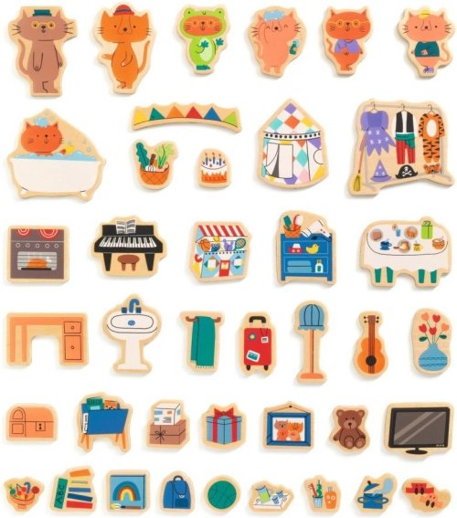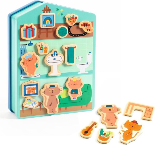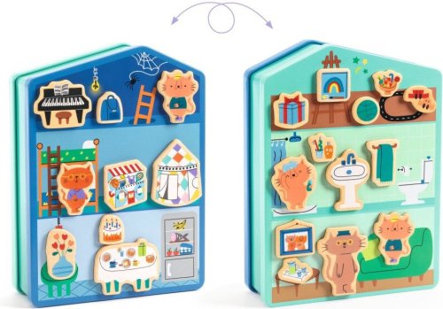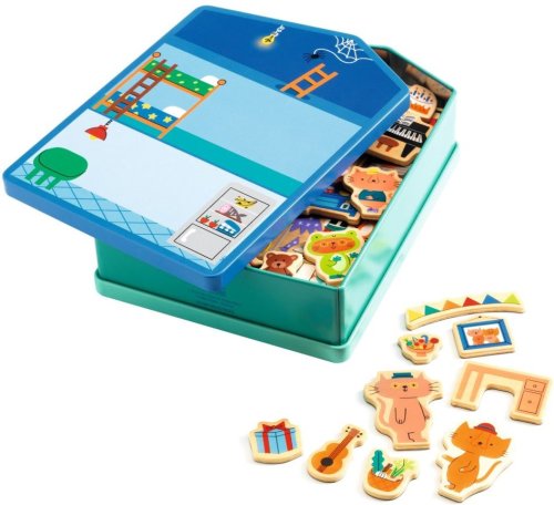 Bavte sa zdobením 6 izieb, aby ste ich oživili (podkrovie, spálňa, kuchyňa, obývacia izba, kúpeľňa a herňa). Kovová krabica v tvare domčeka s vyobrazením na oboch stranách a 40 magnetických drevených dielikov. Vhodné pre deti od 3 rokov.