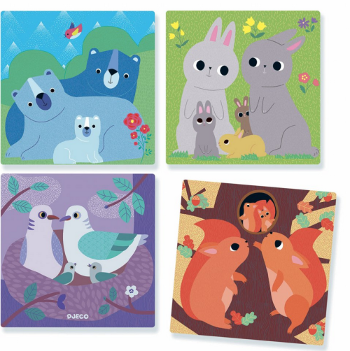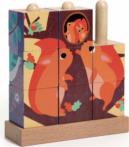 Stohovateľné drevené kocky s obrázkami lesných zvieratiek, ktoré staviate pomocou drevených vodiacich kolíkov na seba. Kocky sú vyrobené z kvalitného dreva s potlačou zvieratiek. Každá kocka je opatrená otvorom z hornej a zo spodnej strany tak, aby ju dieťa mohlo jednoducho nasadiť na pribalený stojan a napájať jednu kocku na druhú. Deti môžu skladať štyri obrázky lesných zvieratiek. Balenie obsahuje: 9 kociek Vhodné pre deti od 3 rokov.