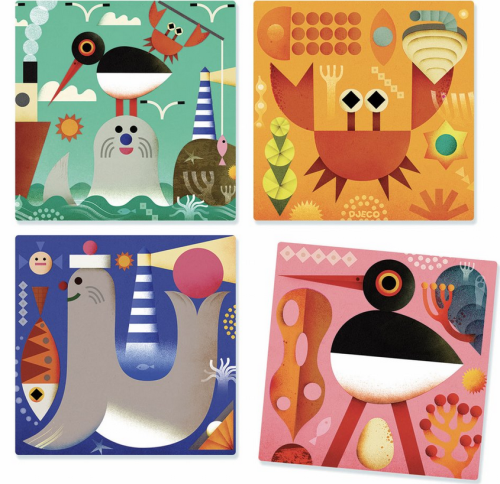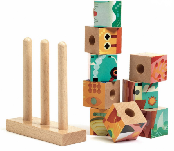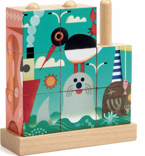 Stohovateľné drevené kocky s obrázkami zvieratiek z mora, ktoré staviate pomocou drevených vodiacich kolíkov na seba. Kocky sú vyrobené z kvalitného dreva s potlačou zvieratiek. Každá kocka je opatrená otvorom z hornej a zo spodnej strany tak, aby ju dieťa mohlo jednoducho nasadiť na pribalený stojan a napájať jednu kocku na druhú. Deti môžu skladať štyri obrázky morských zvieratiek. Balenie obsahuje: 9 kociek Vhodné pre deti od 3 rokov.