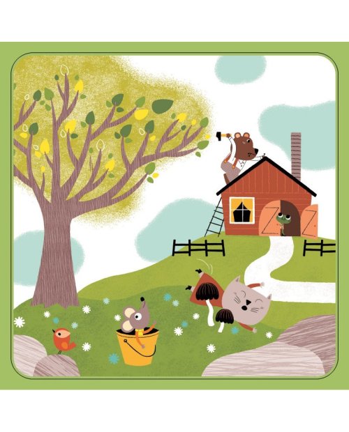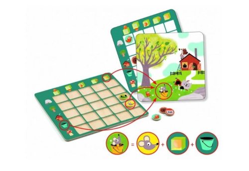 Set obsahuje drevenú hraciu pochu, 20 rôznych kartičiek s obrázkami a 5 žetónov so zvieratkami. Deti musia správne prepojiť zvieratko a objekt, pri ktorom sa nachádza a ešte navyše upresniť umiestnenie zvieratka - nachádza sa psík vedľa domčeka, na domčeku alebo je vo vnútri? Pre deti 4 – 6 rokov. Veľkosť balenia: 21,5 x 21,5 x 3 cm.
