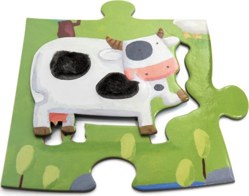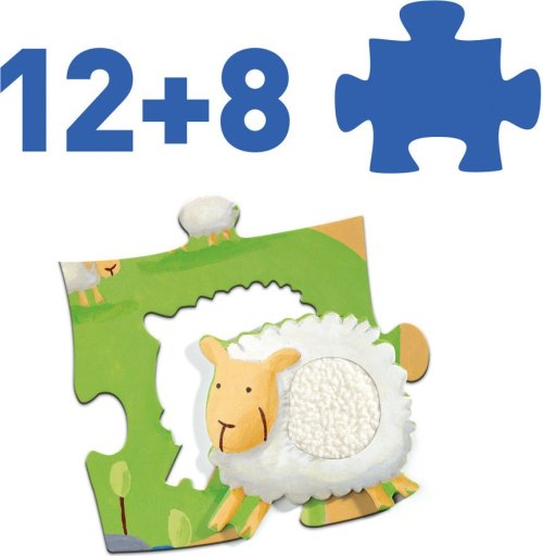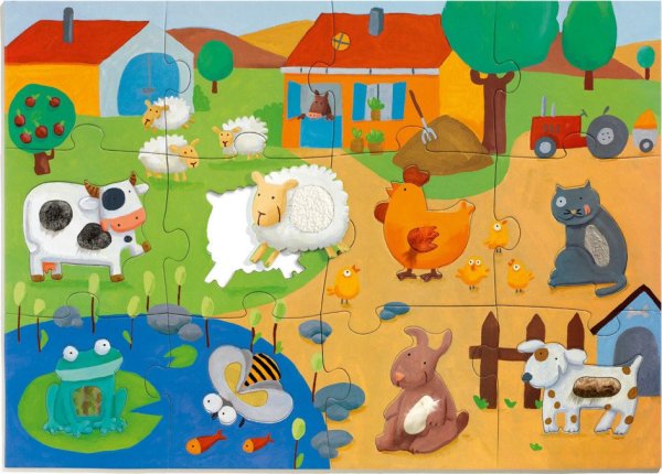 Hmatové puzzle podporuje multizmyslové učenie. Umožňuje deťom nielen zoznámiť sa s domácimi zvieratkami na farme, ale aj vyskúšať si pocit, aké to je si na zvieratko siahnuť. Obrázok je zložený z 12 dielikov. V ôsmich dielikoch sú vložené vkladačky zvieratiek s napodobeninou zvieracej srsti. - 12 dielikové puzzle - 8 dielikov s vkladačkou zvieratka s rôznou textúrou srsti - veľké dieliky - rozvíja jemnú motoriku a hmatové vnímanie Doporučené pre deti od 3 rokov. Rozmer zloženého puzzle cca 70 x 50 cm