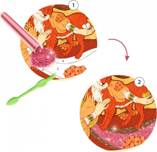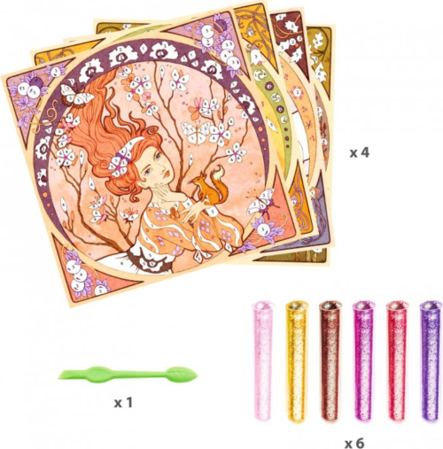 deti umiestnia obrázok do krabice, pomocou dodaného nástroja odkryjú vopred nalepené miesta a posypú trblietky podľa farebne odlíšených pokynov balenia obsahuje: 4 ilustrované karty (20 x 20 cm), 6 tub s flitrami, 1 štetec, 1 plastový nástroj, 1 farebná brožúrka s pokynmi krok za krokom úvod do diela Alphonse Muchy - Mladé ženy ožívajú uprostred zelene súčasná ilustrátorská interpretácia diela veľkého majstra vďaka trblietkam sa obrázkami trbliece a lesknú sa aktivita, pri ktorej deti pracujú v krabici, aby sa zabránilo rozptýleniu trblietok špeciálne navrhnuté vybavenie pre podáva informácie o umelcovi a umeleckom hnutí, ku ktorému patrí papier a karta s certifikáciou FSC®