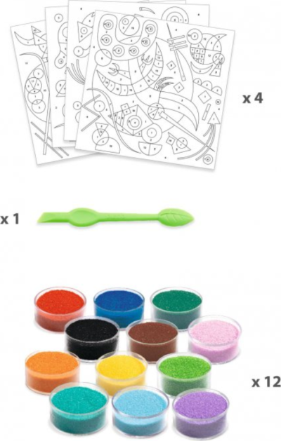 deti umiestnia obrázok do krabice, pomocou dodaného špeciálneho nástroja odkryjú vopred pripravené samolepky a podľa pokynov posypú miesta farebným pieskom balenie obsahuje: 4 ilustrované karty (20 x 20 cm), 12 kvetináčov s farebným pieskom, 1 plastový nástroj, 1 farebná brožúrka s pokynmi krok za krokom úvod do diela Wassily Kandinského súčasná ilustrátorská interpretácia diela veľkého majstra činnosť bez neporiadku: deti pracujú v krabici, aby sa zabránilo rozptýleniu piesku múdra sada, ktorá vám umožní zhromaždiť zvyšky piesku pre nasypanie späť do širokých boxov vysvetľujúca brožúrka podáva informácie o u hnutie, ku ktorému patrí papier a karta s certifikáciou FSC®