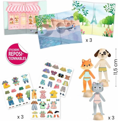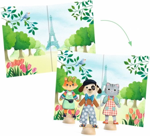 Obliekacia kolážová aktivita, pri ktorej môžete 3 drevené postavičky prezliekať do viac ako 45 kusov oblečenia.