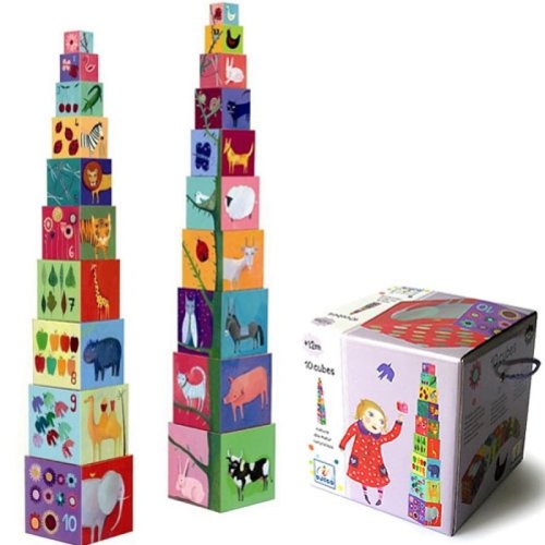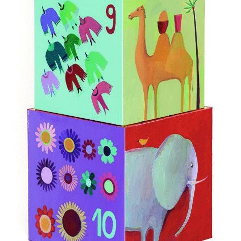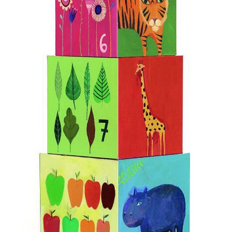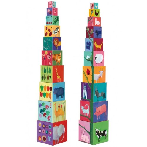 Postavte si krásnu vežu s motívmi zvieratiek a prírody. Kocky môžete stavať na seba, alebo vkladať do seba. Na stenách kociek sa môže dieťa naučiť názvy zvieratiek, farby a čísla. Balenie obsahuje 10 kociek. Veľkosť najväčšej kocky 15 x 15 cm. Výška postavenej veže je 86 cm.