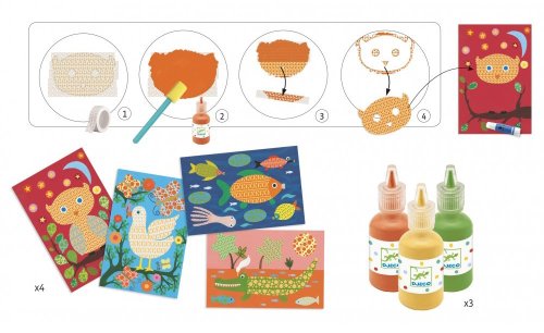 Balenie obsahuje 4 obrázky s rôznym pozadím, 8 obrázkov častí najrôznejších zvieratiek, 3 fľaštičky s farbami červená, žltá a zelená), 3 šablónové pásky, hárok lepiacich bodiek a aplikátor s hubkou.