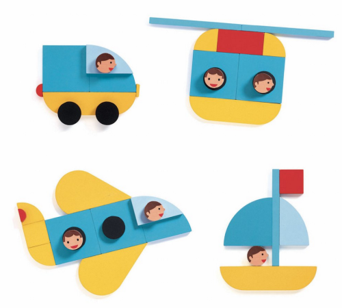 Zábavná pečiatkovacia sada pre deti. Súprava obsahuje 33 farebných drevených dielikov geometrických tvarov, 20 predlôh dopravných prostriedkov a 3 úrovne obtiažnosti označené hviezdičkami. Deti sa tak postupne učia tvary a priestorové vnímanie a môžu si prispôsobovať obtiažnosť. Vhodné pre deti od 3 rokov.