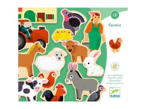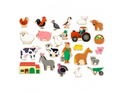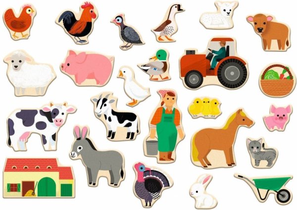 Súprava magnetických drevených dielikov s farmárskou tematikou.