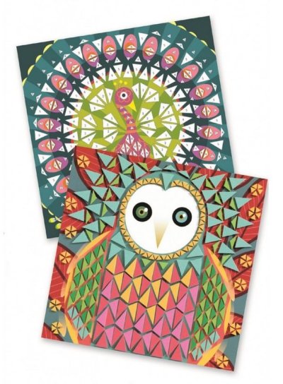 Vytvor dva krásne farebné mozaikové obrázky páva a sovy.