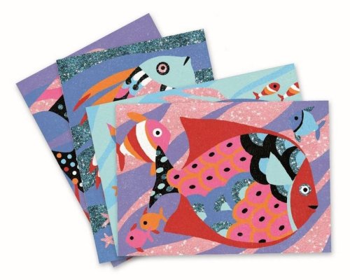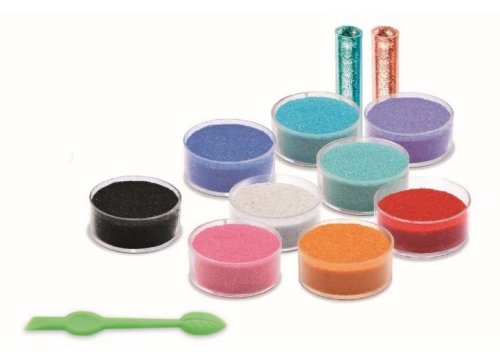 Sada obsahuje: 4 obrázky, 1 špachtľu, 9 téglikov s farebným pieskom a 2 tubičky trblietavých flitrov.