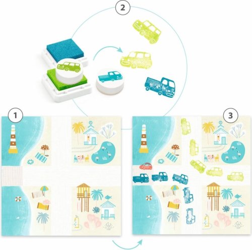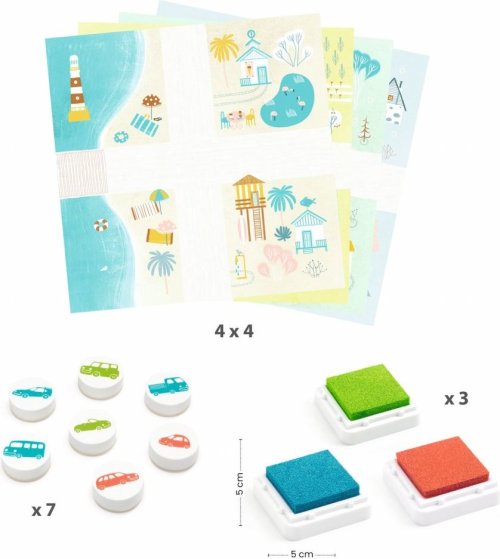 Obsah: 16 ilustrovaných kariet na pečiatkovanie, 3 veľké atramentové vankúšiky (modrá, zelená, oranžová), 7 pečiatok a 1 brožúrka s pokynmi krok za krokom.