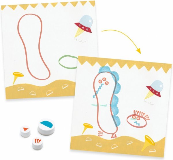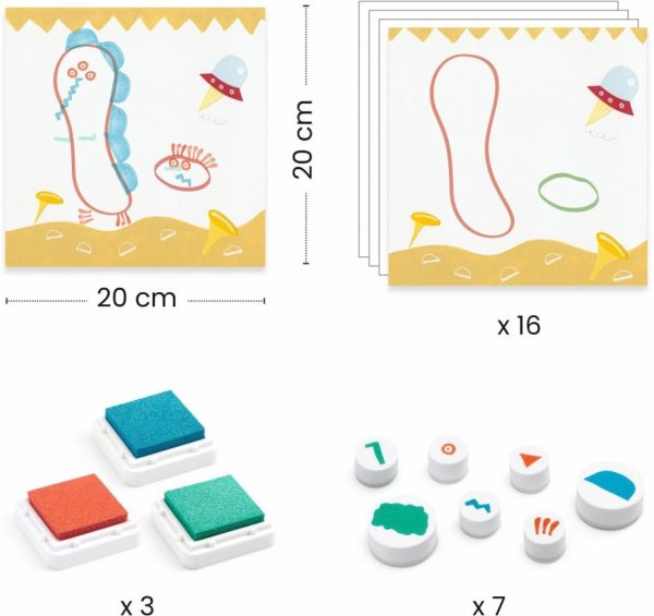 deti sa môžu baviť miešaním kombinácií a popustiť uzdu svojej fantázii balenie obsahuje: 16 ilustrovaných kariet na pečiatkovanie, 3 veľké atramentové vankúšiky (modrá, zelená, oranžová), 7 pečiatok a 1 brožúrka s pokynmi krok za krokom.