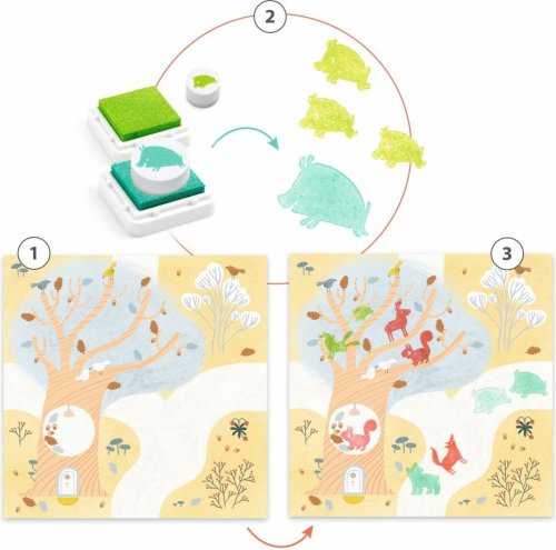 deti sa môžu baviť miešaním kombinácií a popustiť uzdu svojej fantázii balenie obsahuje: 16 ilustrovaných kariet na pečiatkovanie, 3 veľké atramentové vankúšiky (modrá, zelená, oranžová), 7 pečiatok a 1 brožúrka s pokynmi krok za krokom.
