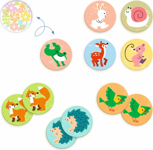 kartónové kartičky, ktoré sa ľahko uchopia rozvíjajú pozorovacie a pamäťové schopnosti krabice v tvare kocky, ktorá sa ľahko a zábavne prepravuje pomocou povrázku vyrobené z papiera a kartónu s certifikáciou FSC® balenie obsahuje 32 kartičiek (16 párov)