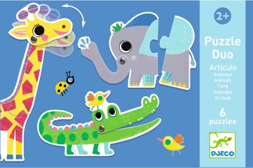 6 dvojdielnych obrysových skladačiek s motívom zvieratiek veľké dieliky, vhodné pre najmenšie deti balené v kartónovej krabičke s uškom na prenášanie ekologické balenie šetrné k životnému prostrediu