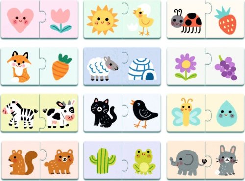 Sada jednoduchých dvojdielnych skladačiek s je určená pre deti, ktoré s puzzle začínajú. Veľké a pevné dieliky s hrúbkou cca 3 mm uľahčujú deťom skladanie. Skladaním puzzle si deti precvičujú predstavivosť, jemnú motoriku, koordináciu oko-ruku, logické myslenie a navyše si užijú srandu.