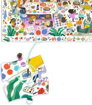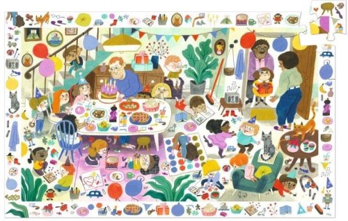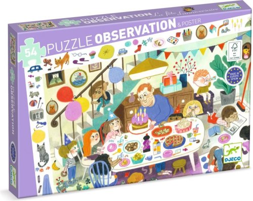 Detské puzzle DJECO Observation spája skladanie so zábavnou hľadacou hrou. Zložte obrázok a zahrajte si postrehovú hru, kto skôr nájde rôzne predmety alebo zvieratká vyobrazené na rámčeku. Súčasťou balenia je plagát vo veľkosti zloženého puzzle slúžiaci ako predloha. Rozmer zloženého puzzle cca 61 x 38 cm