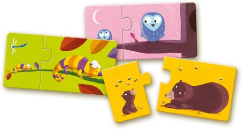 Sada jednoduchých dvojdielnych skladačiek s je určená pre deti, ktoré s puzzle začínajú. Veľké a pevné dieliky s hrúbkou cca 3 mm uľahčujú deťom skladanie. Skladaním puzzle si deti precvičujú predstavivosť, jemnú motoriku, koordináciu oko-ruku, logické myslenie a navyše si užijú srandu. Vhodné pre deti od 3 rokov.