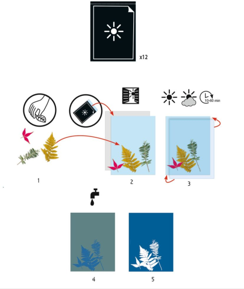 Po vystavení slnečnému žiareniu sa na papieri objavia tiene vzorov. Potom jednoducho opláchnete papier v kúpeli s čistou vodou a výtvory sa odhalia na modrom pozadí! Táto sada umožňuje vytvoriť 8 kompozícií. Táto sada obsahuje 12 listov.