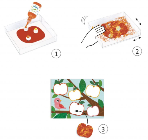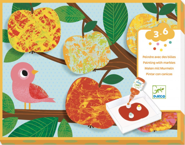 Mramorové obrázky s pomocou sklenených guličiek a farbičiek. Výtvarná sada so sklenenými guličkami a farbičkami. Set obsahuje 21 výsekov kvetov a zvieratiek, 4 obrázky, 3 sklenené guličky a 4 farby a ilustrovaný návod krok za krokom. Deti umiestnia obrázky do krabičky, na skleničky nanesú farby podľa návodu či vlastnej fantázie a jazdia s nimi v krabičke po obrázku. Vytvára tak krásne mramorové obrázky, ktoré môžu umiestniť do rámčeka a vytvoriť tak dekoráciu do izbičky alebo krásny darček pre kamarátov. Vhodné pre deti od 3 rokov.