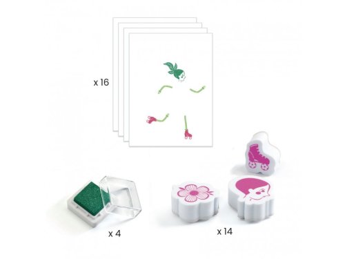 Sada pečiatok, ktorá deťom umožňuje skladať si vlastné postavy kombináciou tvarov a rôznych farieb a vytvárať tak krásne kvetinové outfity. Postupne tlačia pečiatky a tlačia vzory, aby ozdobili poskytnuté scény. Deti bavia vytváranie kombinácií a popúšťanie fantázie. Scény ožívajú zakaždým niečím iným!