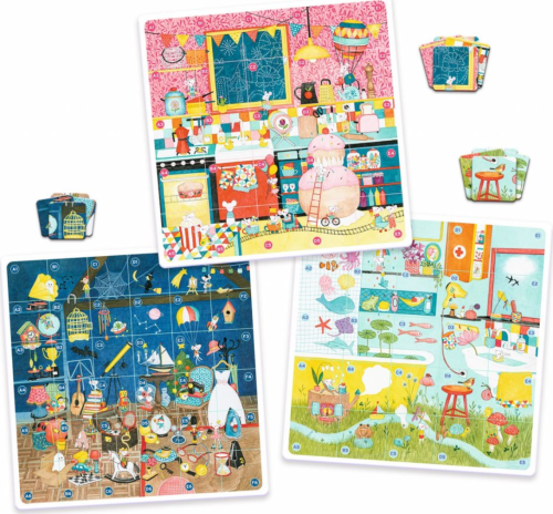 Hra rozvíja slovnú zásobu, vyjadrovanie, pozorovacie a posluchové schopnosti. Príprava hry : Určite rozprávača, ktorý bude popisovať obrázky. Pozrite si 3 veľké obrázky na herných doskách: Kúpeľňa, Kuchyňa, Pôda.