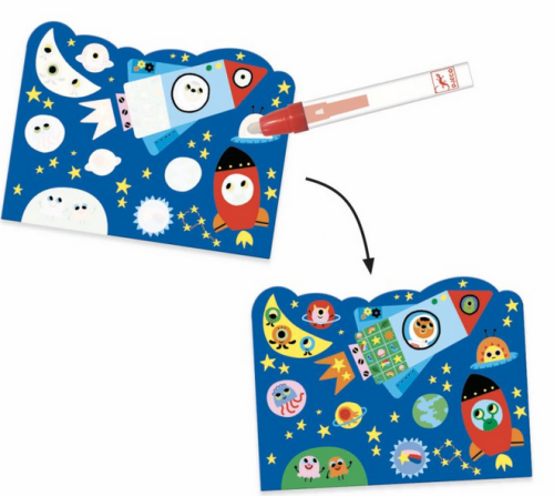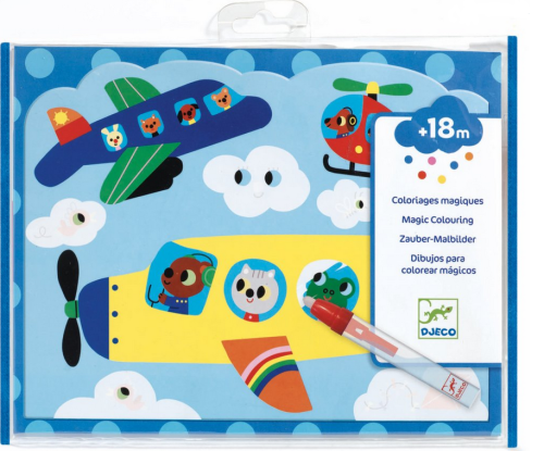 Maľovanie s magickou ceruzkou s opätovne sa odkrývajúcimi obrázkami. Dopravné prostriedky vo vzduchu na 4 obrázkoch o veľkosti 21x26cm sa objavia až po pretretí magickou ceruzkou. Ceruzka sa pred aplikáciou naplní vodou, ktorá umožní objavenie obrázkov v pestrofarebných farbách. Krásne farebný obrázok zostane odkrytý pokiaľ všetka aplikovaná voda nevyschne. Po vyschnutí sa opäť obrázok zahalí do bielej, nepriehľadnej farby a deti môžu znova odkrývať. Nikdy nekončiaca zábava bude deti baviť a zamestná ich na dlhých aj krátkych cestách. Sada obsahuje: 4 obrázky, magickú ceruzku, handričku Všetko zabalené v praktickom obale so zapínaním, aby sa aj na cestách nič nestratilo a deti mohli cez priehľadný obal pozorovať postupne meniaci sa obrázok. Vhodné pre deti od 18 mesiacov.