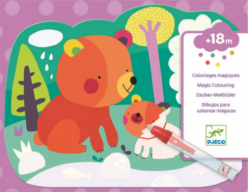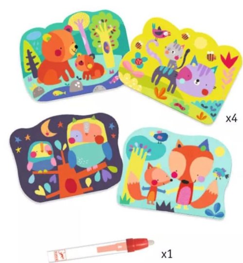 Maľovanie s magickou ceruzkou s opätovne sa odkrývajúcimi obrázkami. Postavičky zvieratiek medvedíka, mačičky, malej sovy či líšky na 4 obrázkoch o veľkosti 21x26cm sa objavia až po pretretí magickou ceruzkou. Ceruzka sa pred aplikáciou naplní vodou, ktorá umožní objavenie obrázkov v pestrofarebných farbách. Krásne farebný obrázok zostane odkrytý pokiaľ všetka aplikovaná voda nevyschne. Po vyschnutí sa opäť obrázok zahalí do bielej, nepriehľadnej farby a deti môžu znova odkrývať. Nikdy nekončiaca zábava bude deti baviť a zamestná ich na dlhých aj krátkych cestách Sada obsahuje: 4 obrázky, magickú ceruzku, handričku Všetko zabalené v praktickom obale so zapínaním, aby sa aj na cestách nič nestratilo a deti mohli cez priehľadný obal pozorovať postupne meniaci sa obrázok . Vhodné pre deti od 18 mesiacov.