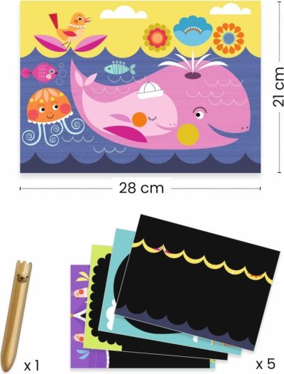 Malé deti potrebujú na tvorenie veľa miesta, takže tu je 5 veľkých stieracích návrhov s motívom zvierat, ktoré si môžu užiť. Na vyškrabávanie použijú veľké drevené obojstranné pero. Sada je vhodná už pre deti od 18 mesiacov. Jednou stranou pera môžu stierať veľké plochy a menšie detaily druhou časťou s ostrejším hrotom. Deti bavia odkrývať plochy a odhaľovať ukryté obrázky. Je možné zoškriabať celú plochu a obrázok aj tak bude podarený.