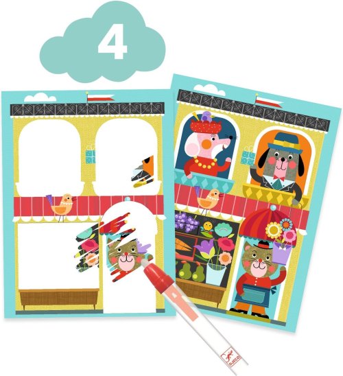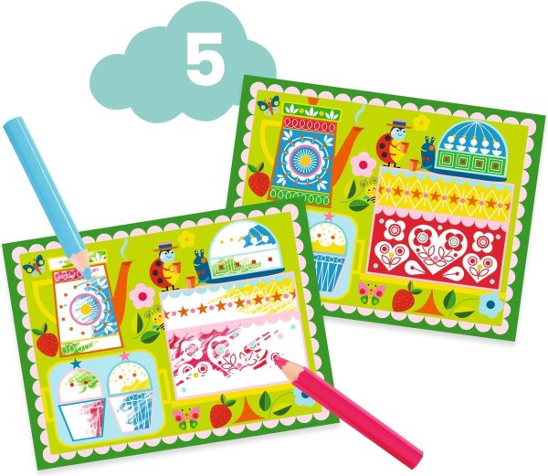 Koláž: 1 ilustrovaná karta, 1 vopred narezaná doska z hrubej lepenky a 1 tuba lepidla. Plstená koláž: 12 dosiek na zdobenie a 4 listy samolepiacich plstených kusov. Color Stop: 4 ilustrované listy, 1 šablóna a 4 farebné ceruzky. Vodové farby: 1 karta s vrstvou bielej a 1 magické pero. Odhalenie farieb: 3 karty na vyfarbenie, s magickým povlakom. Vyškrabávanie: 3 karty a 1 drevený nástroj. 1 návod krok za krokom.