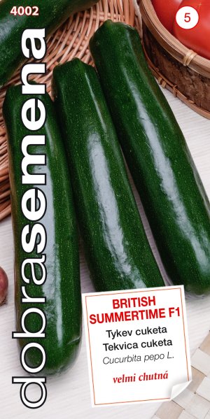 BRITISH SUMMERTIME F1 - výnimočná cuketa s otvoreným habitom a minimom ostňov pre ľahkú zber - "easy pick" cuketa. Raný a vysoko úrodný hybrid. Štíhle a dlhšia tmavo zelené plody si zachovávajú štíhly tvar aj pri prerastania. Sú jemné a veľmi chutné. Plody žnite postupne, keď dosiahnu dĺžky 15 - 20 cm.