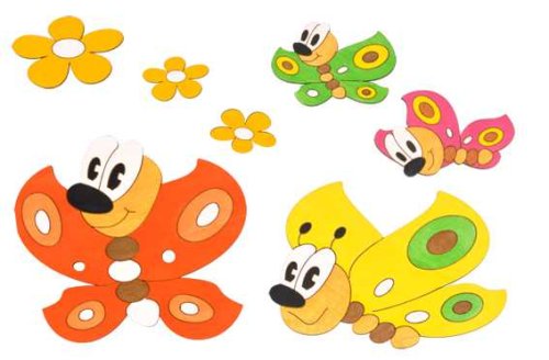 Krásne, ručne maľované dekorácie na ozdobenie detskej izbičky. Rozmery sú približné. Balenie obsahuje: 2 ks motýliky väčšie, 2 ks motýliky menšie, 3 ks kvetinka Hlavné vlastnosti: obojstranná lepiaca páska súčasťou baleniavhodná aj ako drobný darčekvyrobené z kvalitných materiálovzodpovedá súčasným európskym bezpečnostným normám