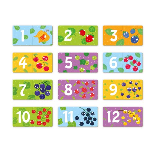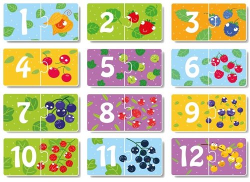 Sada jednoduchých dvojdielnych skladačiek s motívom ovocia pomáha najmenším deťom učiť sa prvé čísla a počítanie.