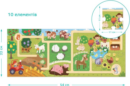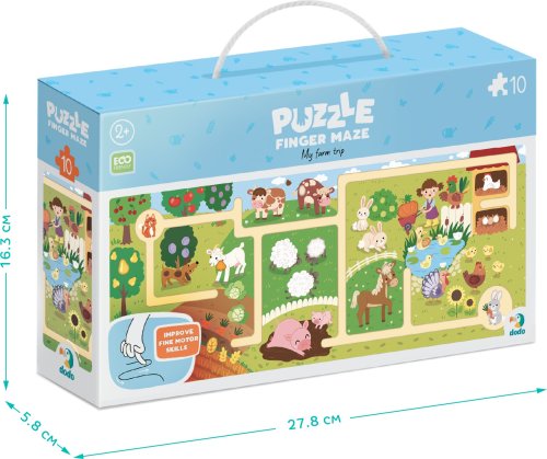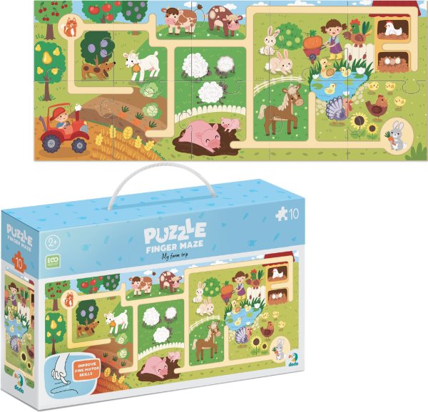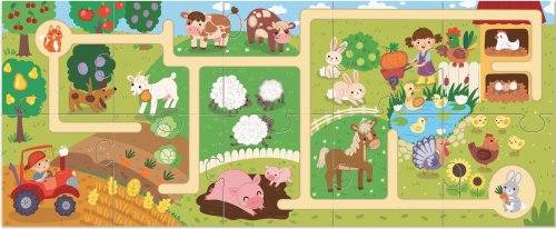 Interaktívne puzzle „Moja farma“ s 10 prvkami tvorí zaujímavý labyrint s drážkami, ktoré dieťa môže prechádzať prstom. Ilustrácia zachytáva život na farme – traktory, záhrady a roztomilé zvieratá ako kravy, ošípané, králiky, ovce, kuriatka a kačica. Dieťa objavuje farmu a jej obyvateľov hravou formou. Puzzle rozvíja jemnú motoriku, koordináciu, pozornosť a logické myslenie. Ideálne pre deti od 2 rokov. Skvelý darček pre malých milovníkov zvierat a fariem. Hrajte sa, objavujte a bavte sa!