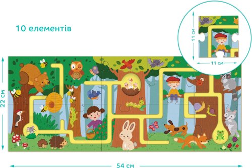 Interaktívne puzzle „Moja lesná cesta“ s 10 prvkami tvorí labyrint so špeciálnymi drážkami, po ktorých dieťa môže viesť prst a prechádzať trasu lesom. Ilustrácia ukazuje veveričky, zajačikov, ježkov, vtáčiky a ďalšie zvieratá, ktoré dodávajú hre kúzlo. Dieťa objavuje detaily a spoznáva lesných obyvateľov. Puzzle rozvíja jemnú motoriku, koordináciu, pozornosť a predstavivosť. Ideálne pre deti od 2 rokov. Hravé učenie a zábava v jednom!