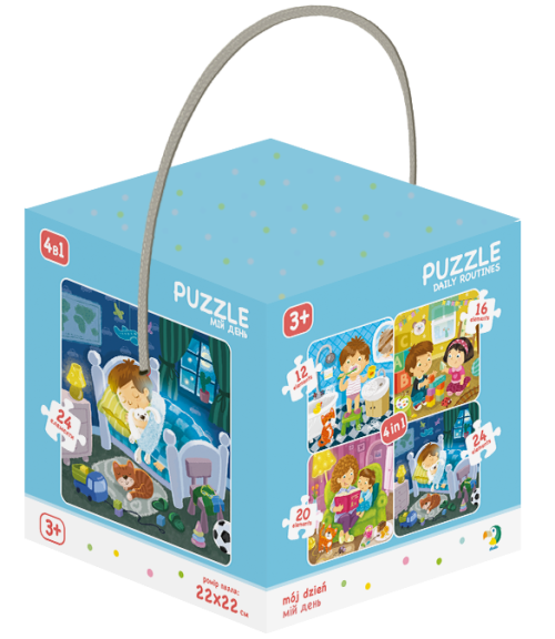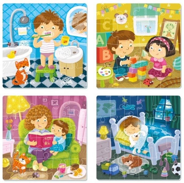 Detské puzzle značky DODO s obrázkami denných činností. Progresívne puzzle s rôznou obtiažnosťou - 4 puzzle s 12 - 24 dielikmi. Rozmer zloženého puzzle cca 22 x 22 cm