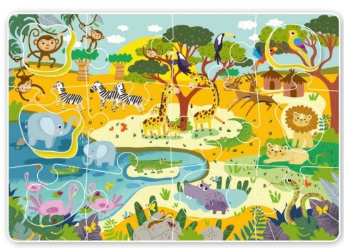 Skladanie spestruje 6 špeciálne tvarovaných dielikov v tvare zvieratiek zo safari. Rozmer zloženého puzzle cca 31 x 45 cm