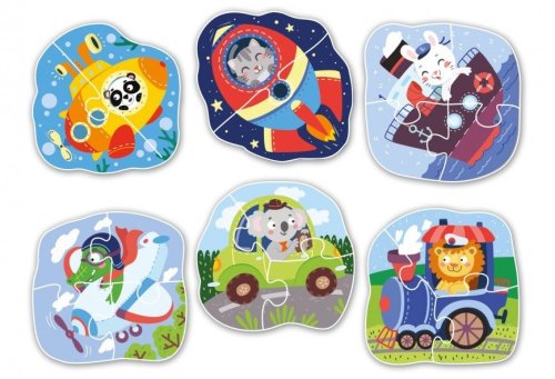 Detské obrysové puzzle DODO s motívom šiestich zvieratiek a dopravných prostriedkov.