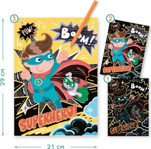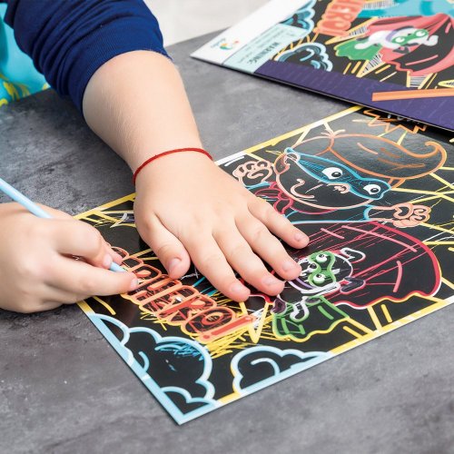 Zábava s farebným koncom! Škrabacie obrázky DODO prebúdza kreativitu, učia trpezlivosti, predstavivosti a jemnej motorike. Táto činnosť zamestná malých výtvarníkov na dlhé hodiny. Papier je potiahnutý čiernou vrstvou skrývajúcou podklad s farebným efektom, ktorý z kresby urobí nevšedný pohľad. Priloženým škrabacím perom vyškriabte linky predtlačeného obrázku. Obsah balenia: