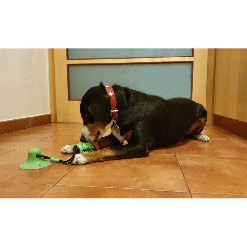 Pokiaľ má váš pes veľa energie a rád hryzie a trhá najrôznejšie predmety, kúpte mu hračku pre psov Doggie. Táto viacúčelová hračka vášho psieho maznáčika na nejaký čas spoľahlivo zabaví. Doggie môžete naplniť granulami alebo maškrtami, ktoré budú pri hryzení a ťahaní vypadávať. Získavanie odmeny tak psa ešte viac motivuje k „zápaseniu“ s hračkou. Zároveň vďaka gumovým výstupkom slúži interaktívna hračka ako psia kefka na zuby. Je vyrobená z gumy a pevného lana a tak odolá stiskom zubov aj ťahaniu, ale nie je nezničiteľná. Použitie hračky je ľahké - prísavku na jednom konci hračky pripevnite na hladkú podlahu alebo stenu s hladkým povrchom a pes si s ňou už ďalej poradí sám. S hračkou Doggie zaistíte vášmu psíkovi dostatok zábavy, upútate jeho pozornosť a môžete mu dať denný prídel krmiva zábavným spôsobom. Parametre: Celková dĺžka hračky s prísavkou aj lanom: 42 cm Rozmery hryzacej časti: 12 x 5 cm Váha: 215 g