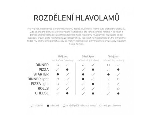 Hlavolam je určený pre všetky psy (mačky ai) a ich pániky. Buďte preto po celú dobu hry so svojim štvornohým priateľom a dávajte bacha na to, aby hru hral správne, motivujte ho a kontrolujte, aby hracie kamene alebo hru nehrýzol.