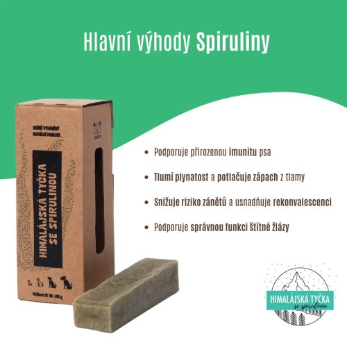 Spirulina navyše podporuje prirodzenú imunitu psa, tlmí plynatosť a potláča zápach z papule. Znižuje riziko zápalov a podporuje správnu funkciu štítnej žľazy.