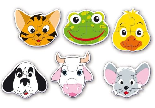 Obrysové progresívne puzzle pre malé deti so šiestimi motívmi hlavičiek zvierat.