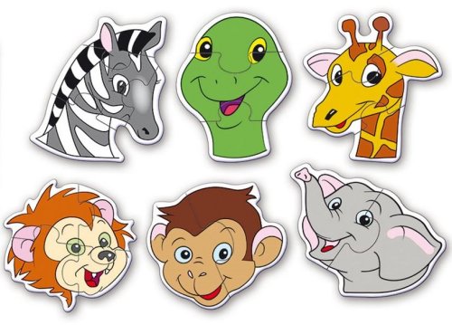 Obrysové progresívne puzzle pre malé deti so šiestimi motívmi hlavičiek zvierat zo safari.